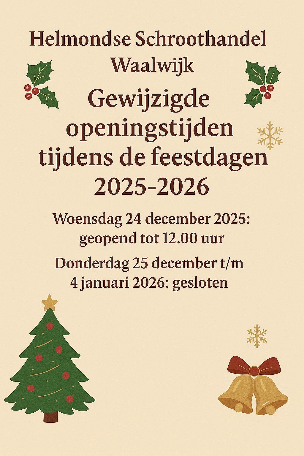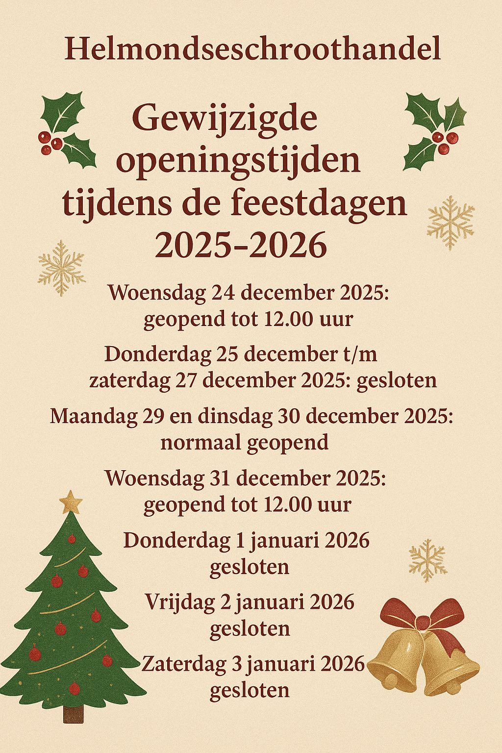 Wij van de Helmondse Schroothandel wensen u hele mooie feestdagen toe en een goed begin van het nieuwe jaar. We zien u in 2026 dan ook graag weer terug!